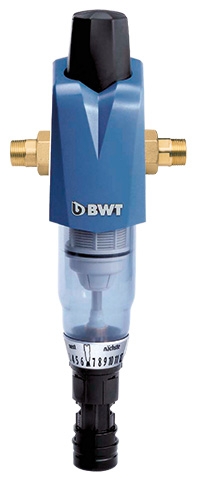 Filter komplett mit Messingkopfteil und High-Tech-Werkstoffen, mit Rückspüleinheit und Abwasseranschluss DN 50, inklusive Anschlusstechnik.