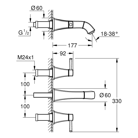 GROHE 3-Loch-WT-Batterie Grandera 20622 Wandmontage FMS Ausladung 177mm chrom