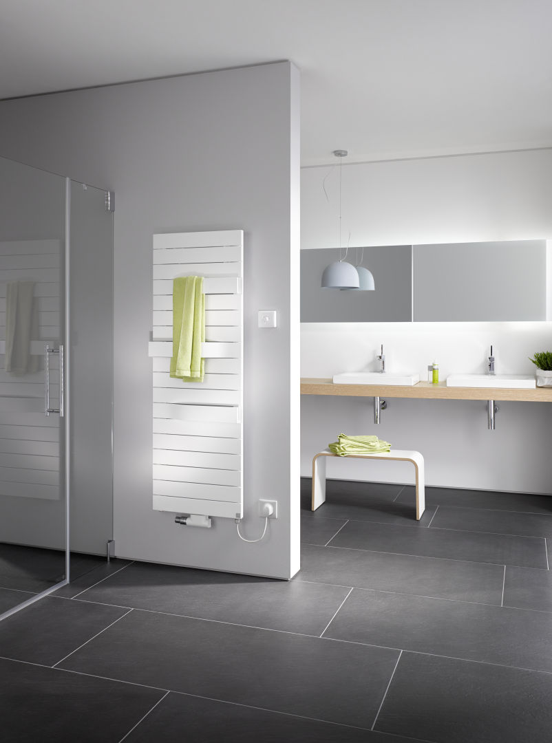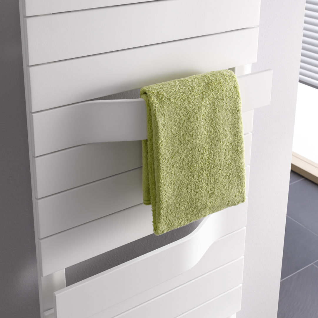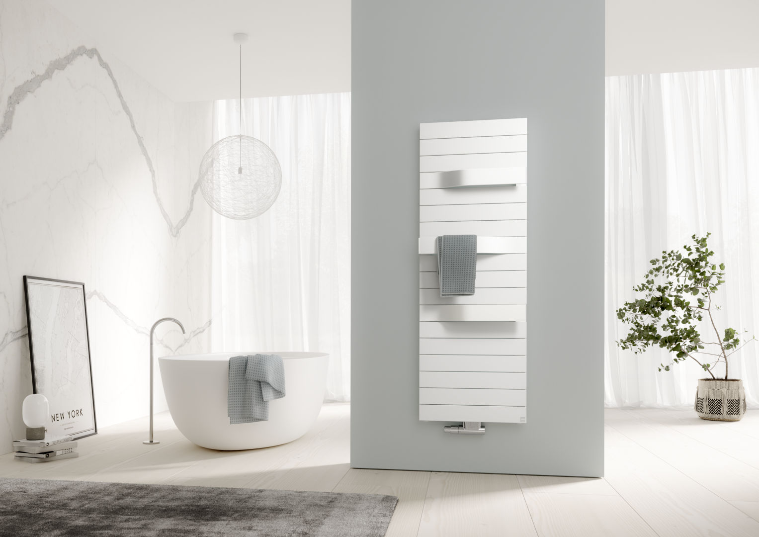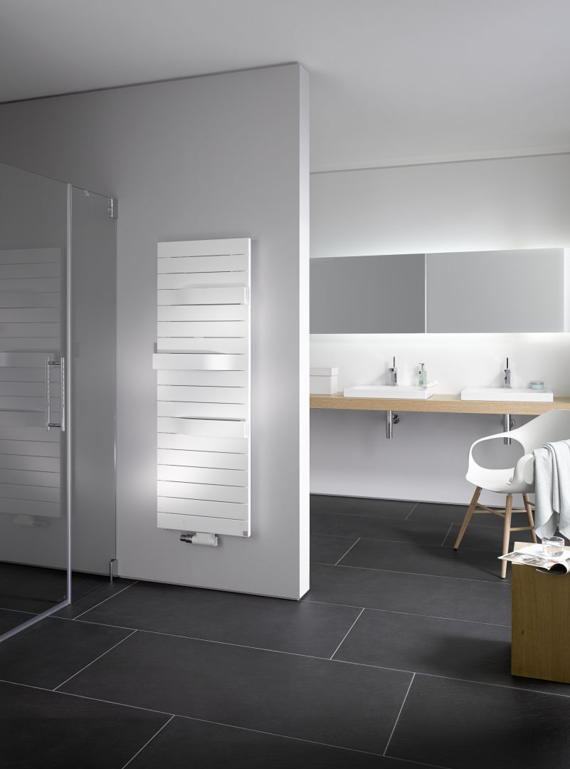 Sein hoher Wärmekomfort überzeugt. Seine Optik mit klarer Form, den charakteristischen Fugen und den dynamisch aus der Fläche heraustretenden Handtuchbügeln machen ihn im Raum zu einem repräsentativen Designerstück.