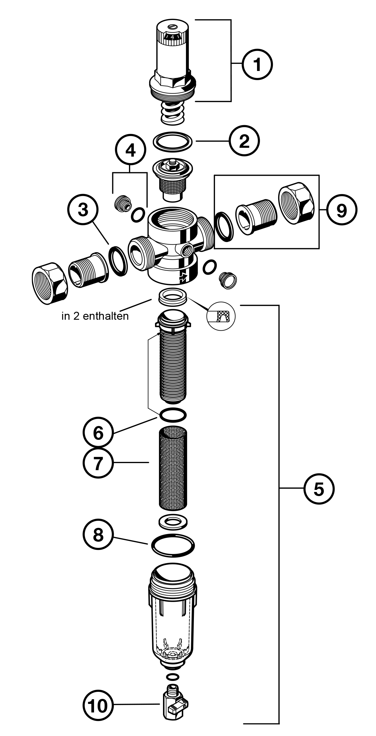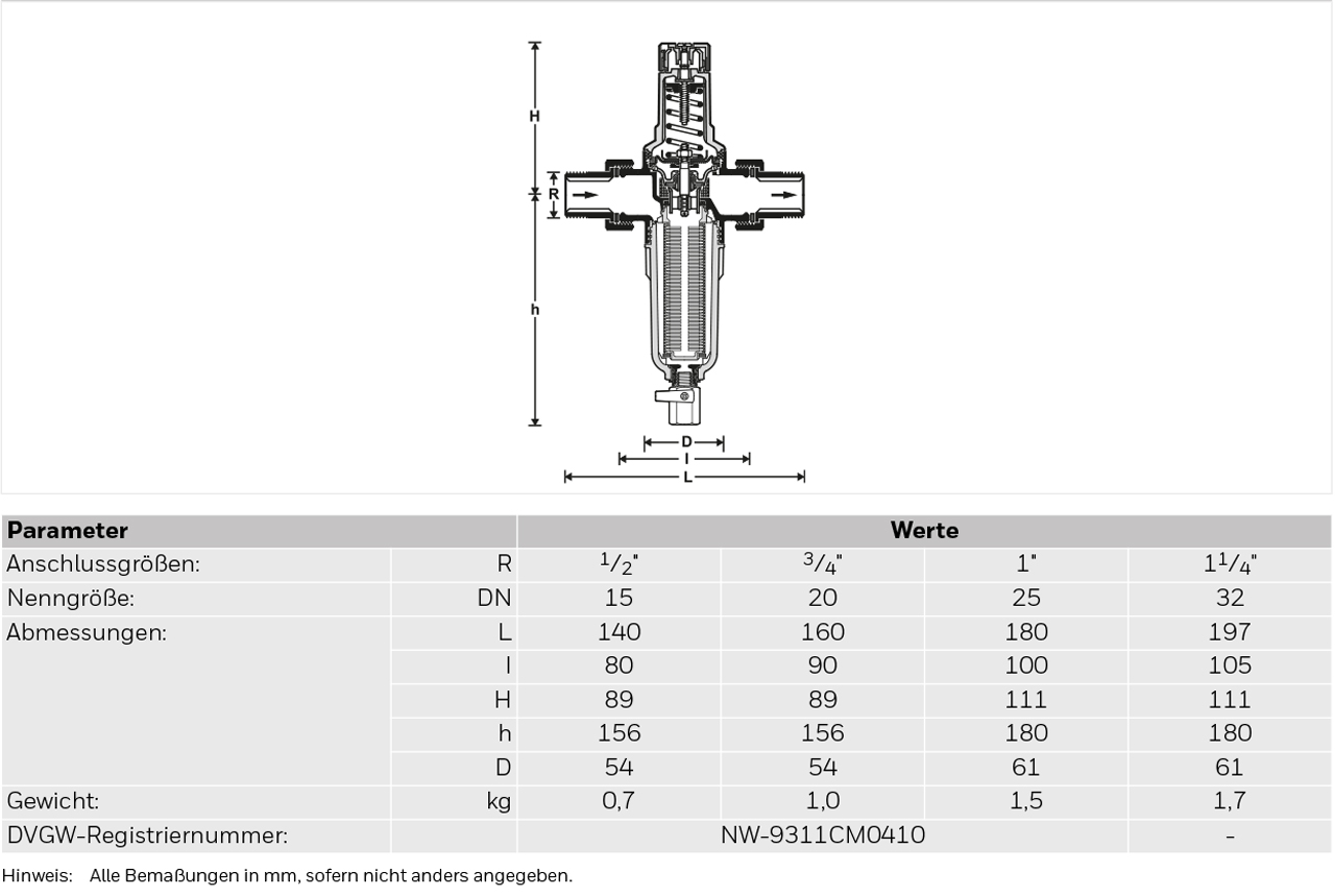 Filterkombination mit Feinfilter in Klarsicht-Filtertasse und entlastetem Druckminderer, schallschutzgeprüft in Gruppe I, ohne Auflage. Gehäuse aus entzinkungsbeständigem Messing. Federhaube, Innenteile und Filtertasse aus hochwertigem Kunststoff, Feinsieb aus nicht rostendem Stahl. Dichtungen aus elastischen, kerbfesten und alterungsbeständigen Elastomeren. Gehäuse beiderseits mit Manometeranschluss G 1/4".
