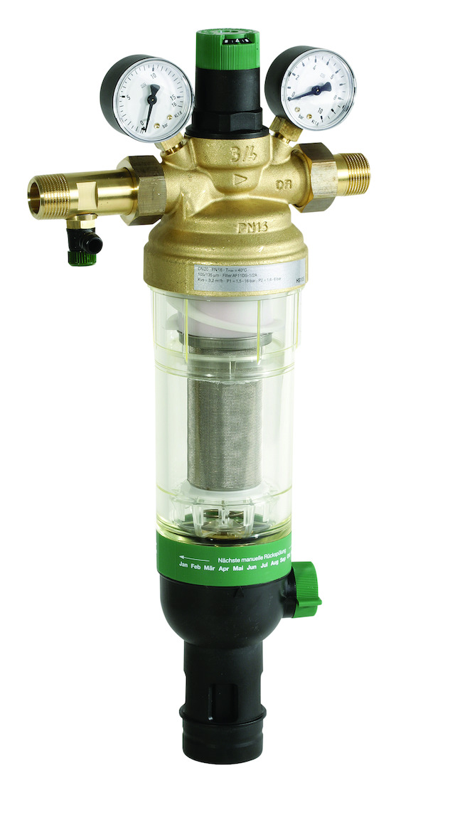 Druckminderer, rück- und ausspülbarem Feinfilter, Rückflussverhinderer, ausgangsseitiger Gewindeverschraubung, Vor- und Hinterdruckmanometer, Ablaufanschluss AA76-1/2A, mit Belüftungsöffnungen nach DIN 1988, Teil 4. Mit Doppelringschlüssel für Federhaube und Filtertasse. Gehäuse und Verschraubungen aus Messing, Federhaube und Innenteile aus hochwertigen Kunststoffen, Feinfilter aus nichtrostendem Stahl. Mit Memoryring als Hinweis auf die nächstfällige manuelle Rückspülung. (Rückspülvorgang automatisierbar mit Rückspülautomatik Z11S).