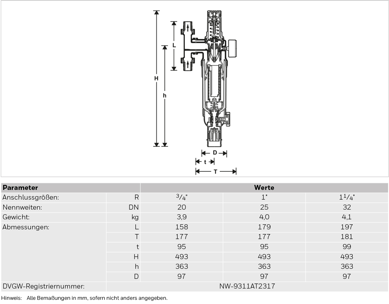 Druckminderer DVGW-bauteilgeprüft, schallschutzgeprüft Gruppe I ohne Auflage, rück- und ausspülbarem Feinfilter DIN/DVGW-geprüft. Mit Manometer, Doppelringschlüssel für Federhaube und Filtertasse, Befestigungsschrauben, Formdichtung und Ablaufanschluss AA76-1/2A, mit Belüftungsöffnungen nach DIN 1988 Teil 4. Gehäuse aus Rotguss zum Anschrauben an drehbares Anschlussstück für waagrechte und senkrechte Rohrleitungen. Federhaube, Klarsicht-Filtertasse und Innenteile aus hochwertigen Kunststoffen, Dichtungen aus elastischen alterungsbeständigen, kerbfesten Elastomeren, Feinfilter aus nichtrostendem Stahl. Mit Memoryring als Hinweis auf die nächstfällige manuelle Rückspülung. (Rückspülvorgang automatisierbar mit Rückspülautomatik Z11S).