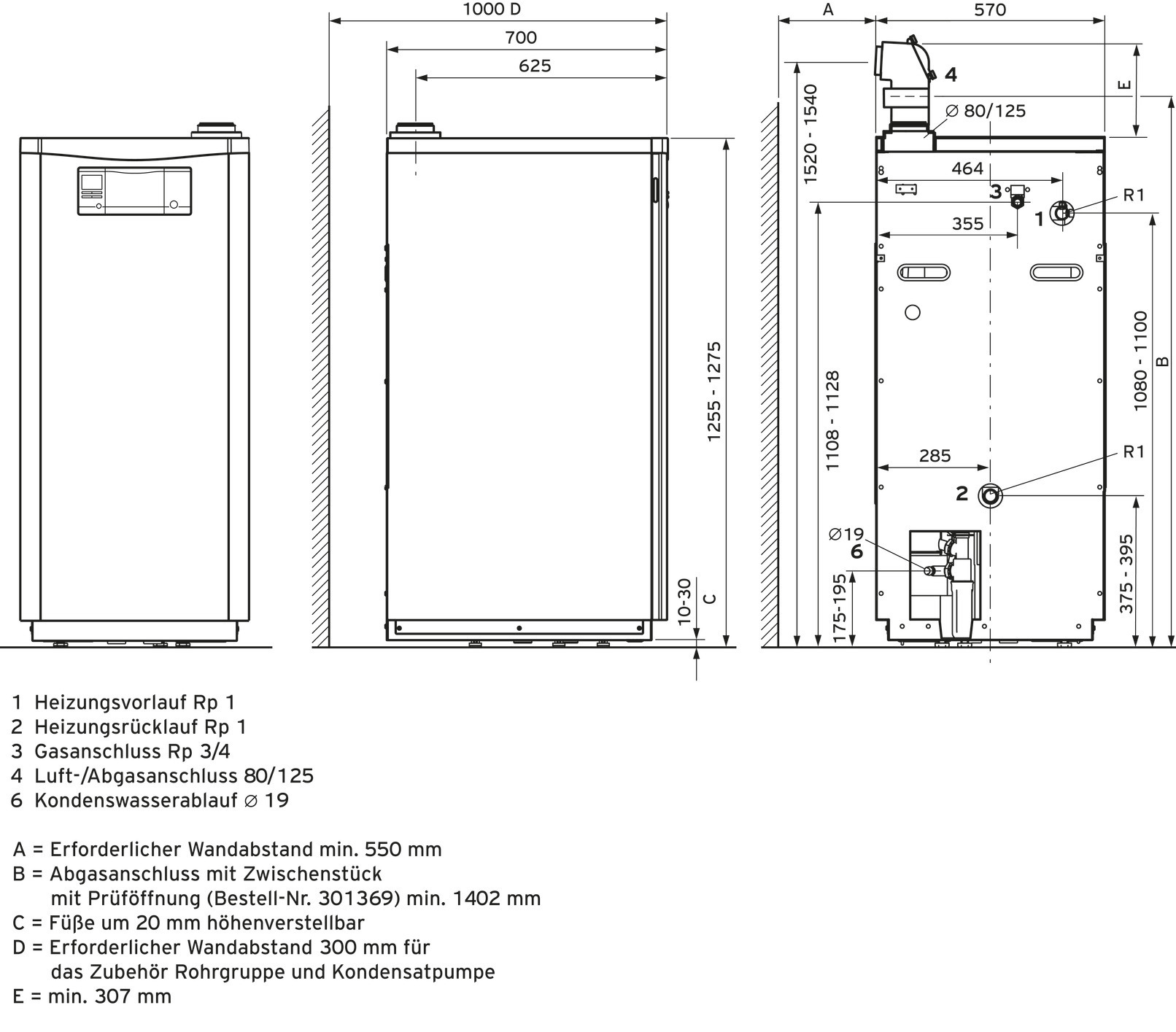 Aufstellmaß Kessel: ca. 1.255 × 570 × 700 mm