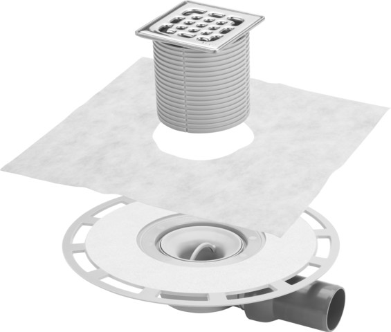 Aufsatz mit Rahmen Edelstahl 1.4404, Aufsatz 100x100 mm, Rost Edelstahl 1.4301, Bauschutz, Schlüter-KERDI-Abdichtungsmanschette, Abdichtungsflansch, Geruchverschluss herausnehmbar, Zulauf DN40, Ablaufrohr mit Kugelgelenk klebbar (ASA)