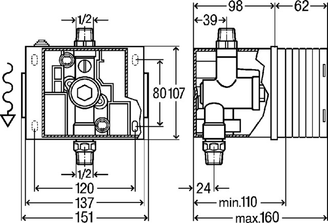 Urinal-Wasserstrecke senkrecht vormontiert im Rohbaugehäuse, Revisionsschacht, Durchspülstopfen, Absperrung, Armaturenanschluss R½