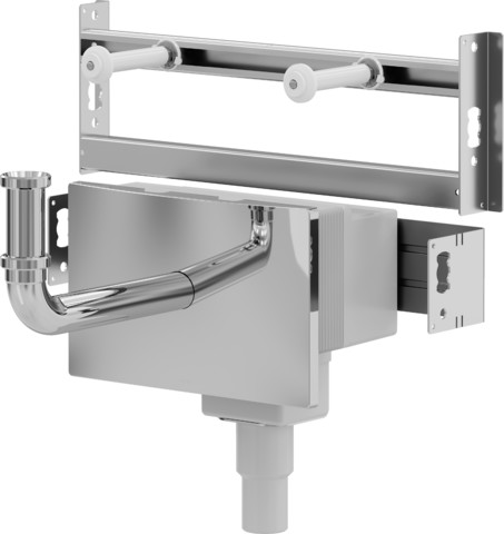 Befestigung höhenverstellbar, UP-Anschlussbox-Befestigungsmaterial, Geruchverschluss höhenverstellbar, Gumminippel DN40/30, 2 Wanddurchführungen, 2 Eckventile G½ -G3/8, 2 Doppelverschraubungen gerade mit Quetschverschraubungen für Kupferrohr d10, 2 Anschlussrohre verchromt d10, Ablaufbogen 300 mm Messing verchromt, Abdeckplatte Kunststoff verchromt für UP-Anschlussbox, Befestigungsmaterial für Modul und Keramik