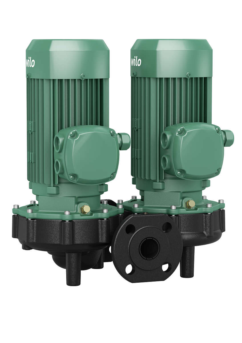 Inline-Doppelpumpe mit zwei einstufigen Trockenläufer-Kreiselpumpen in gemeinsamen Gehäuse mit Umschaltklappe im Druckstutzen. Pumpe in kompakter Inline-Bauform mit direkt angeflanschten Drehstrommotor und ungeteilten Wellen oder mit Laternen und durch Kupplungen starr verbundenen Norm-Motoren (Ausführung N).