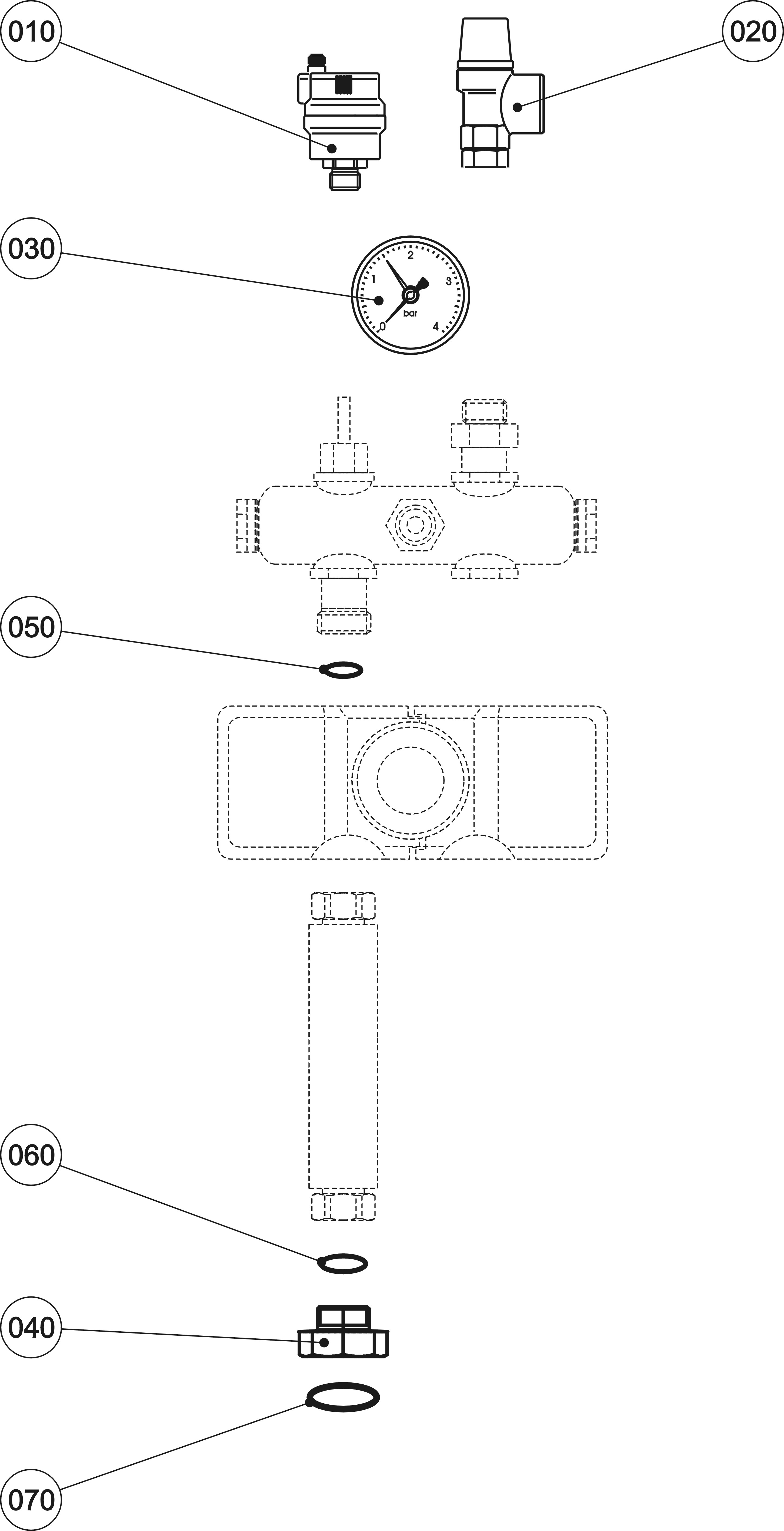 Sicherheitsventil mit 3bar Ansprechdruck, Manometer und je 1 KFE-Hahn im Vor-und Rücklauf
